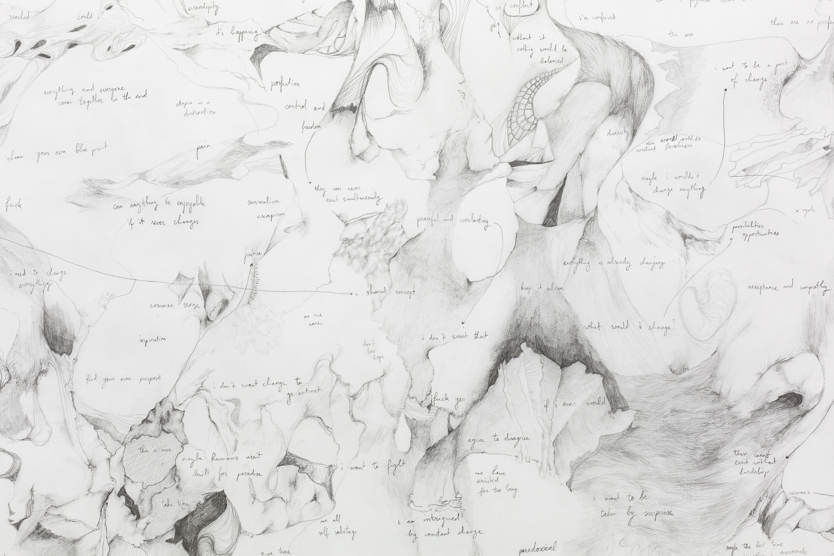 While deconstructing and reconstructing my own thoughts, I created a non-existent, subconscious world that allows you to ask questions and give them room to breathe and grow. These little pockets of wonderland take you away to a self-aware utopia that we can also find in common concepts such as activism, religion, diversity, personal growth and more.
